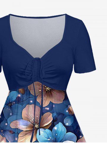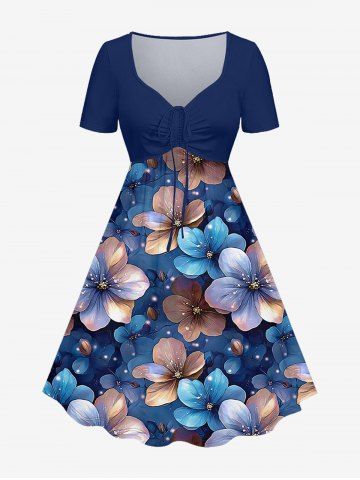 Plus Size Flowers Leaf Glitter 3D Print Cinched Hawaii Dress - Deep Blue - L