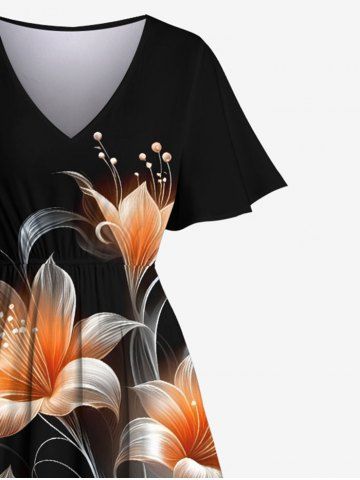 Plus Size Flowers Leaf Glitter 3D Print Split Hawaii Midi Dress - Black - S
