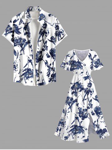 Plus Size Flowers Leaf Ink Painting Print Split Hawaii Midi Dress - White - 4x