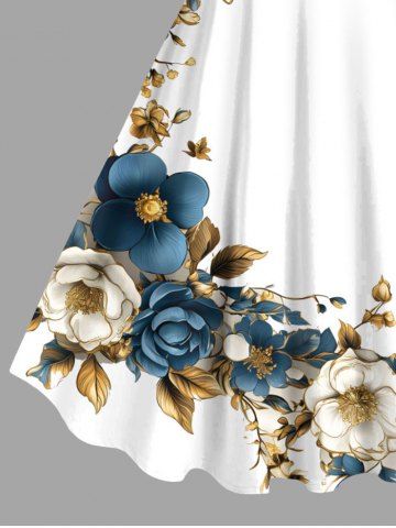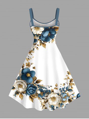Plus Size Flowers Leaf Metallic Print Hawaii Tank Dress - White - M