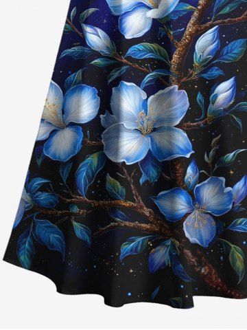 Plus Size Flowers Leaf Moon Galaxy Star Print Cold Shoulder Crisscross Hawaii Maxi Dress - Navy Blue - Xxs