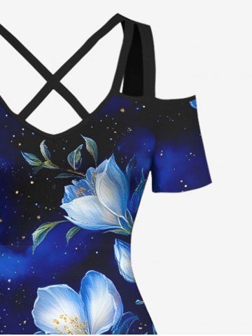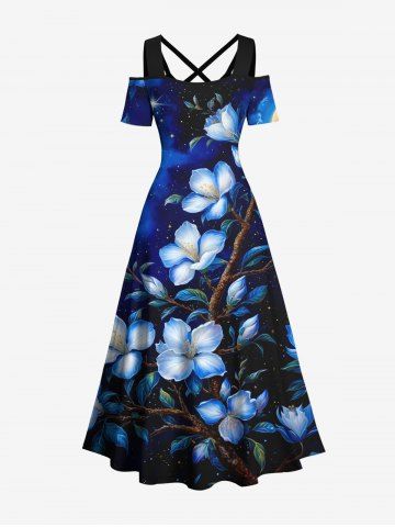 Plus Size Flowers Leaf Moon Galaxy Star Print Cold Shoulder Crisscross Hawaii Maxi Dress - Navy Blue - 4x