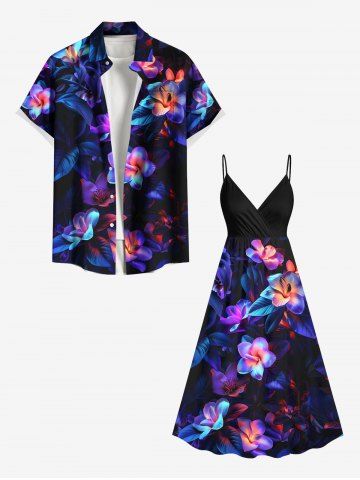 Flowers Leaf Neon Print Plus Size Matching Hawaii Beach Outfit For Couples