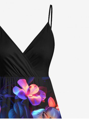 Plus Size Flowers Leaf Neon Print Surplice Hawaii Cami Dress - Black - 5x