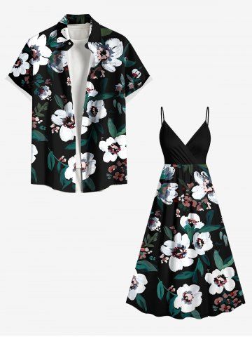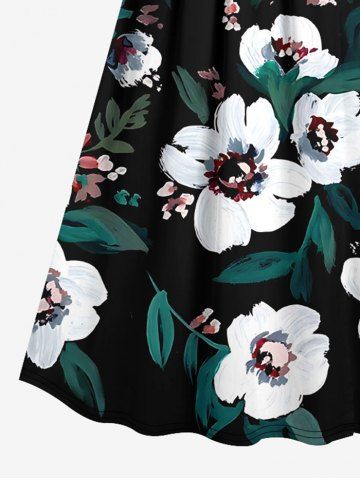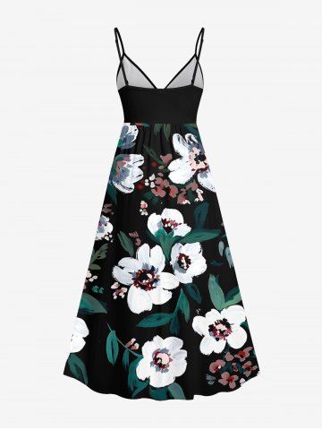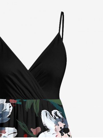 Plus Size Flowers Leaf Oil Painting Print Surplice Hawaii Cami Dress - Black - 2x