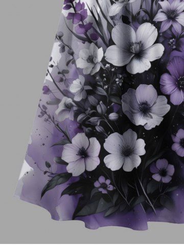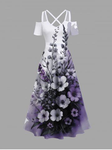 Plus Size Flowers Leaf Ombre Colorblock Print Cold Shoulder Crisscross Hawaii Maxi Dress - Light Purple - M