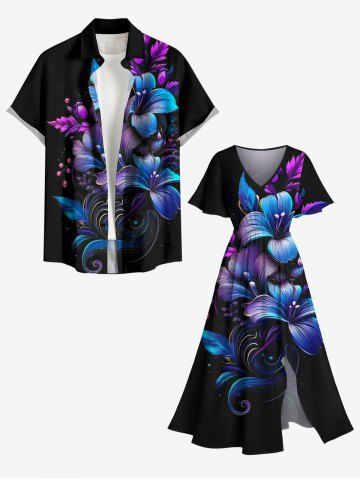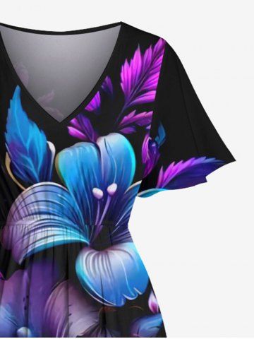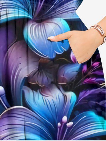 Plus Size Flowers Leaf Ombre Print Split Hawaii Midi Dress - Black - 1x