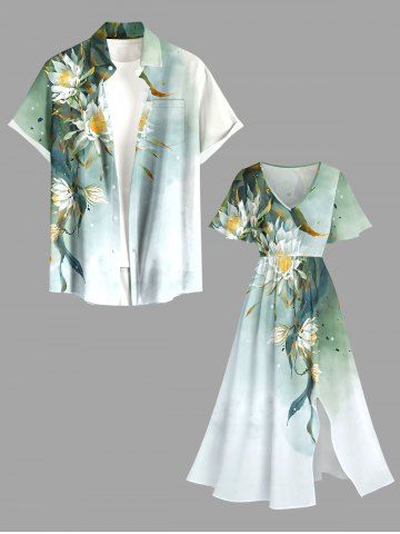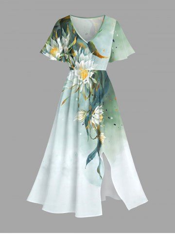 Plus Size Flowers Leaf Ombre Print Split Hawaii Midi Dress - Green - 5x