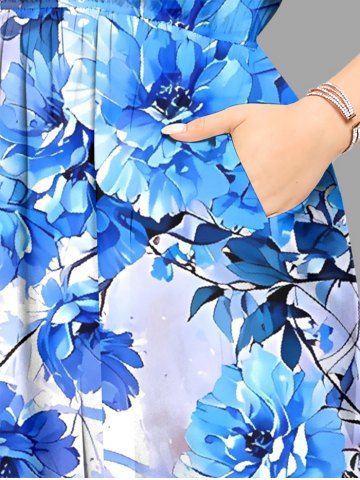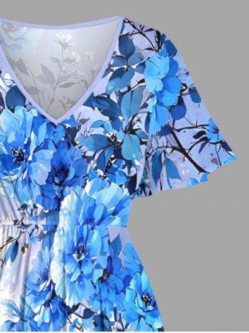 Plus Size Flowers Leaf Paint Splatter Print Split Hawaii Midi Dress - Blue - Xxs