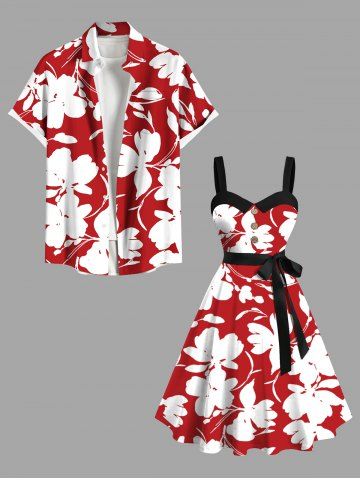 Plus Size Flowers Leaf Print Buttons Turn Down Collar Hawaii Dress With Belt - Red - S