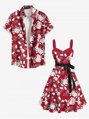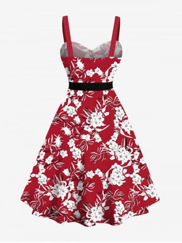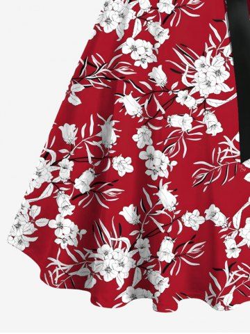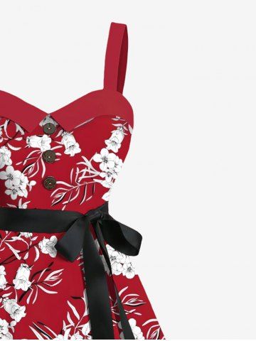 Plus Size Flowers Leaf Print Buttons Turn Down Collar Hawaii Dress With Belt - Red - Xs