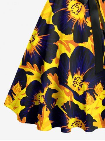 Plus Size Flowers Leaf Print Buttons Turn Down Collar Hawaii Dress With Belt - Yellow - M