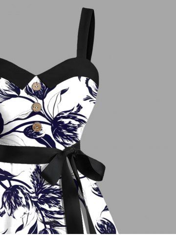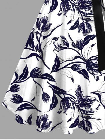 Plus Size Flowers Leaf Print Buttons Turn Down Collar Hawaii Dress With Belt - Black - 5x