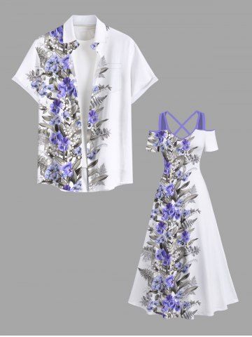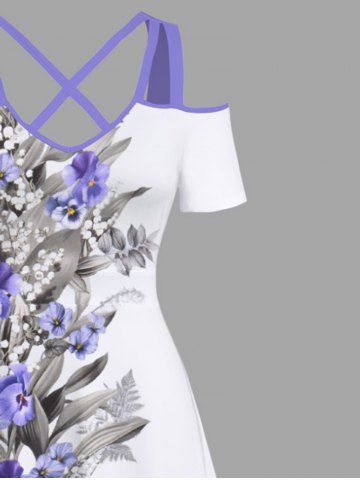 Plus Size Flowers Leaf Print Cold Shoulder Crisscross Hawaii Maxi Dress - White - S