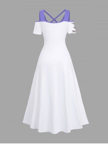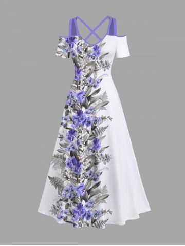 Plus Size Flowers Leaf Print Cold Shoulder Crisscross Hawaii Maxi Dress - White - 3x