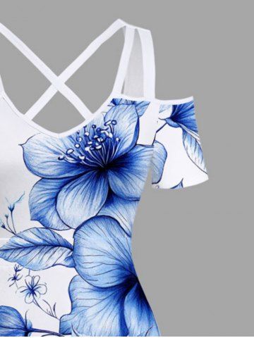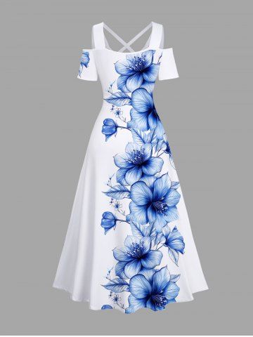 Plus Size Flowers Leaf Print Cold Shoulder Crisscross Hawaii Maxi Dress - White - 2x