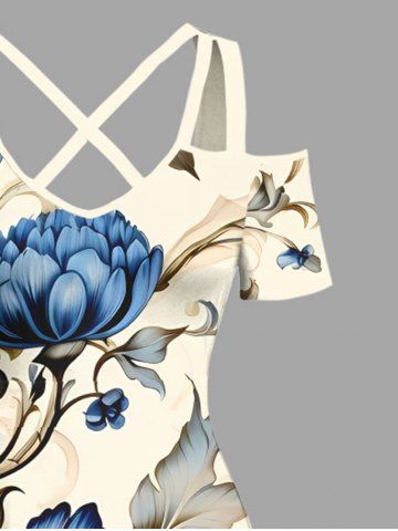 Plus Size Flowers Leaf Print Cold Shoulder Crisscross Hawaii Maxi Dress - Light Coffee - L