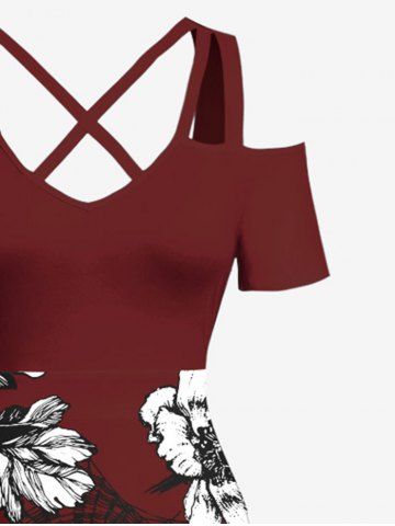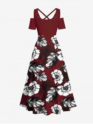 Plus Size Flowers Leaf Print Cold Shoulder Crisscross Hawaii Maxi Dress - Deep Red - Xs