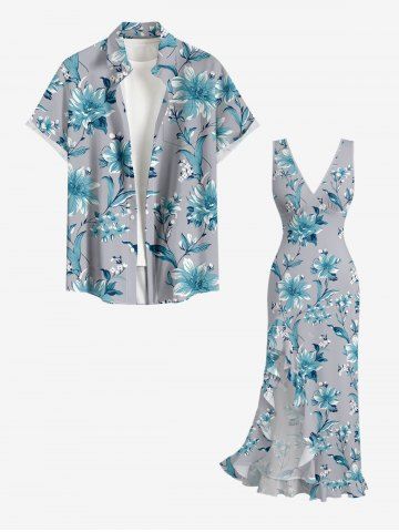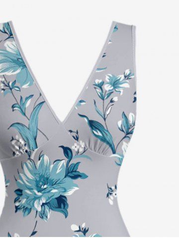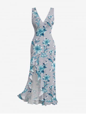 Plus Size Flowers Leaf Print Hawaii Ruffles Split Surplice Dress - Light Gray - S