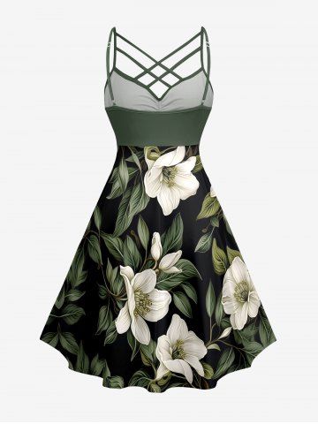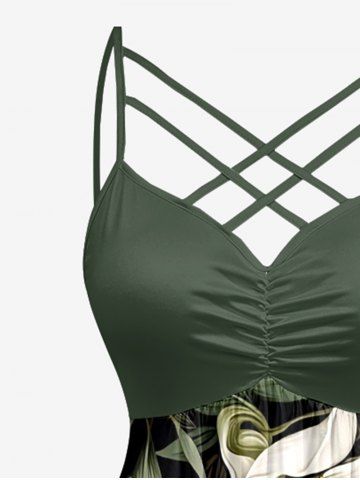 Plus Size Flowers Leaf Print Ruched Lattice Crisscross Straps Hawaii Dress - Plant Green - Xs