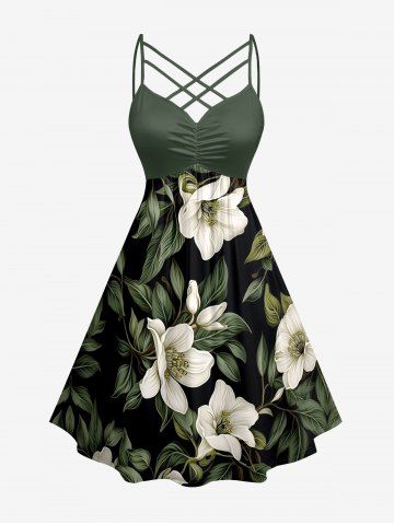 Plus Size Flowers Leaf Print Ruched Lattice Crisscross Straps Hawaii Dress - Plant Green - 6x