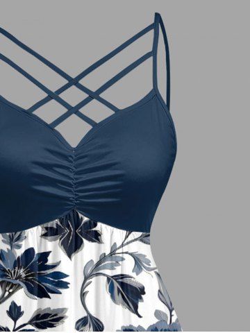 Plus Size Flowers Leaf Print Ruched Lattice Crisscross Straps Hawaii Dress - Deep Blue - 5x