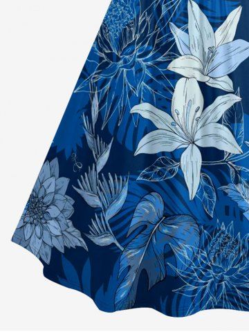 Plus Size Flowers Leaf Print Ruched Lattice Crisscross Straps Hawaii Dress - Blue - Xs