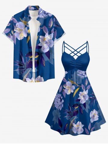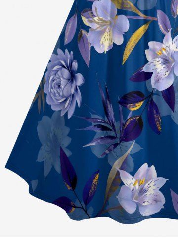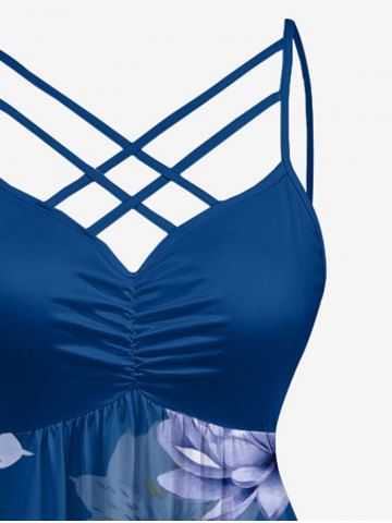 Plus Size Flowers Leaf Print Ruched Lattice Crisscross Straps Hawaii Dress - Blue - 4x
