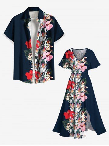 Plus Size Flowers Leaf Print Split Hawaii Midi Dress - Black - 1x