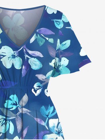 Plus Size Flowers Leaf Print Split Hawaii Midi Dress - Blue - 2x