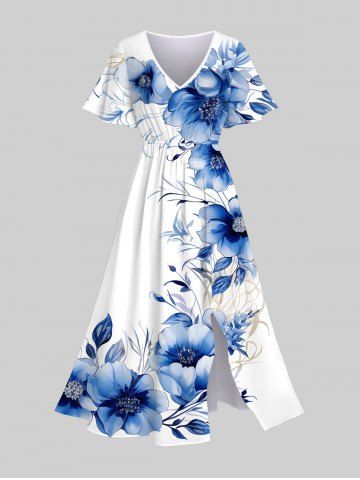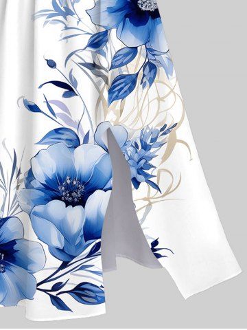Plus Size Flowers Leaf Print Split Hawaii Midi Dress - Blue - L