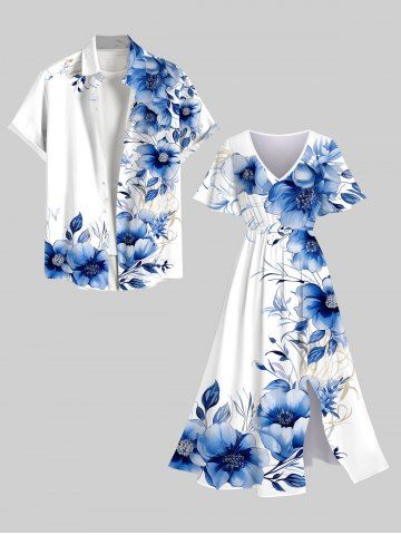 Plus Size Flowers Leaf Print Split Hawaii Midi Dress - Blue - 2x