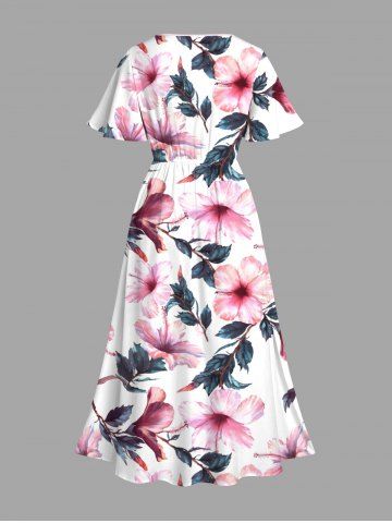 Plus Size Flowers Leaf Print Split Hawaii Midi Dress - Light Pink - S