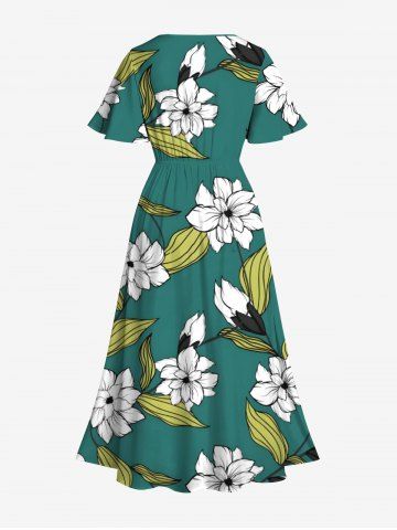 Plus Size Flowers Leaf Print Split Hawaii Midi Dress - Green - L