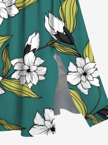 Plus Size Flowers Leaf Print Split Hawaii Midi Dress - Green - 1x