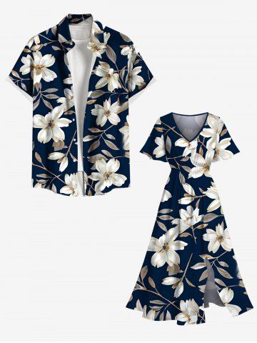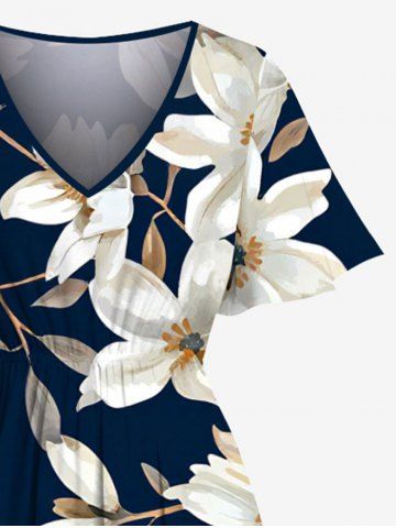 Plus Size Flowers Leaf Print Split Hawaii Midi Dress - Midnight Blue - 4x