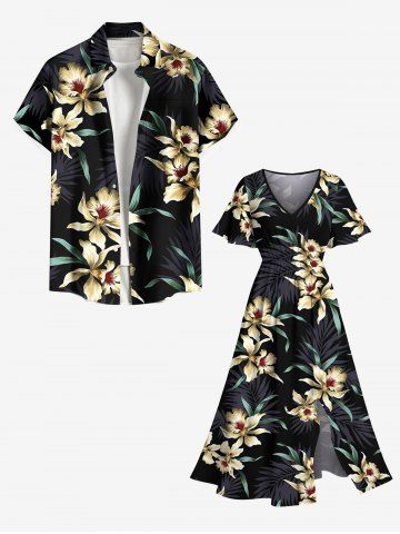Plus Size Flowers Leaf Print Split Hawaii Midi Dress - Black - 2x