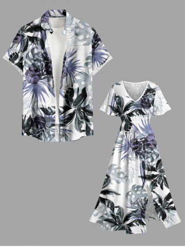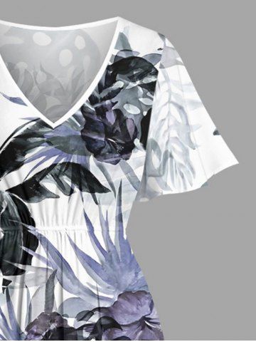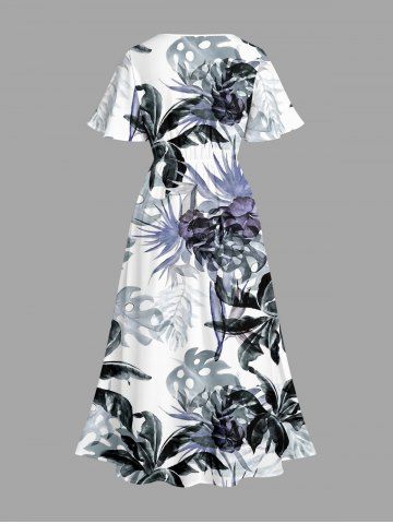 Plus Size Flowers Leaf Print Split Hawaii Midi Dress - White - M