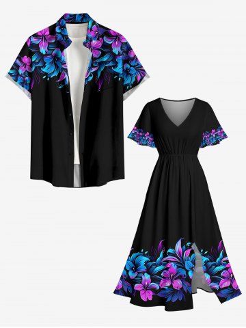 Plus Size Flowers Leaf Print Split Hawaii Midi Dress - Black - 4x