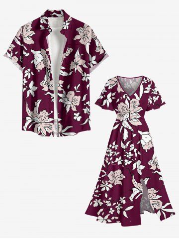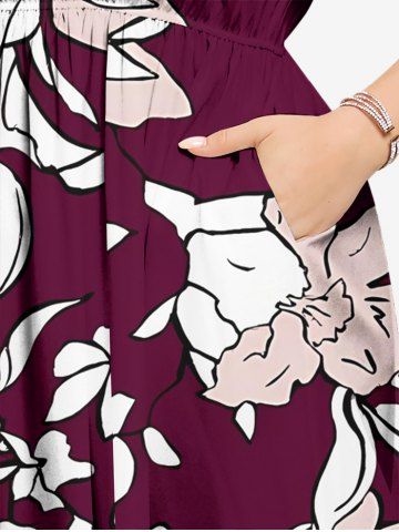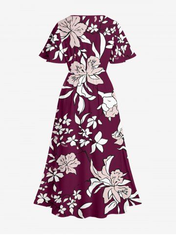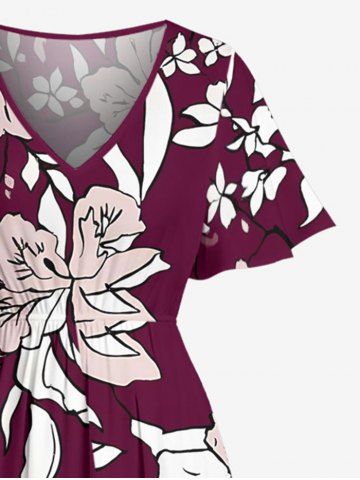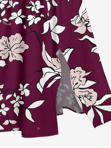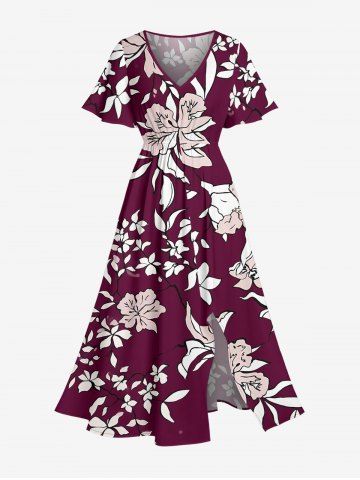 Plus Size Flowers Leaf Print Split Hawaii Midi Dress - Red Wine - 3x