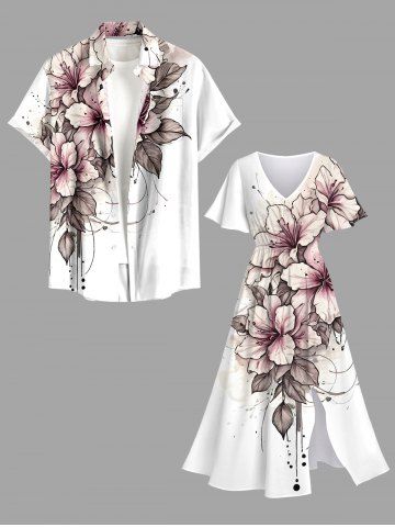 Plus Size Flowers Leaf Print Split Hawaii Midi Dress - White - 5x