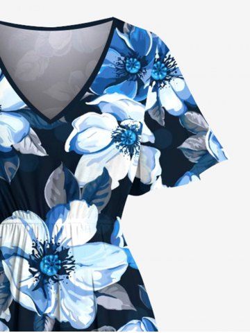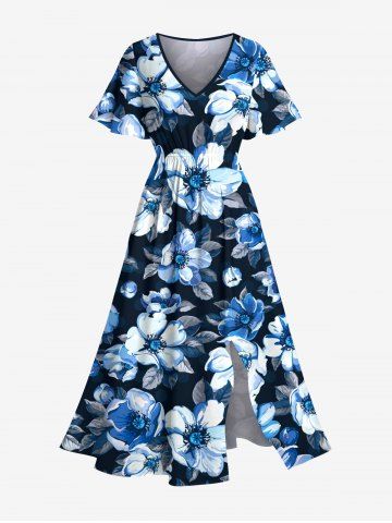 Plus Size Flowers Leaf Print Split Hawaii Midi Dress - Deep Blue - 1x