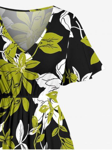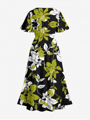 Plus Size Flowers Leaf Print Split Hawaii Midi Dress - Green Yellow - Xs