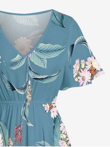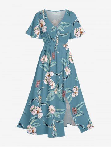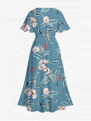 Plus Size Flowers Leaf Print Split Hawaii Midi Dress - Light Blue - Xs