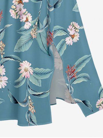 Plus Size Flowers Leaf Print Split Hawaii Midi Dress - Light Blue - L