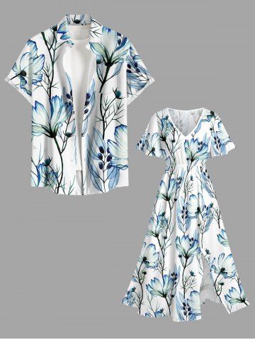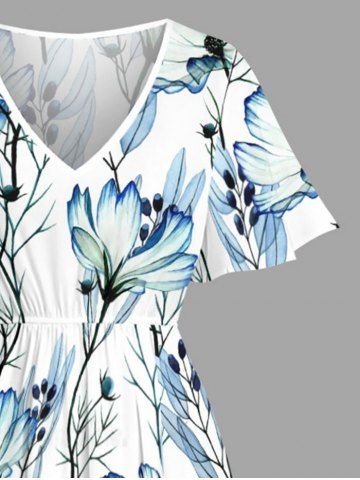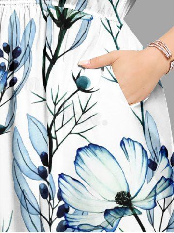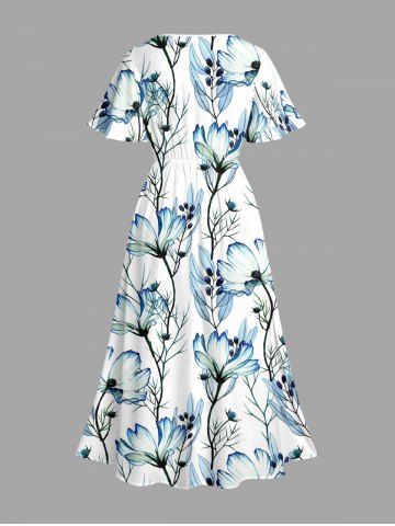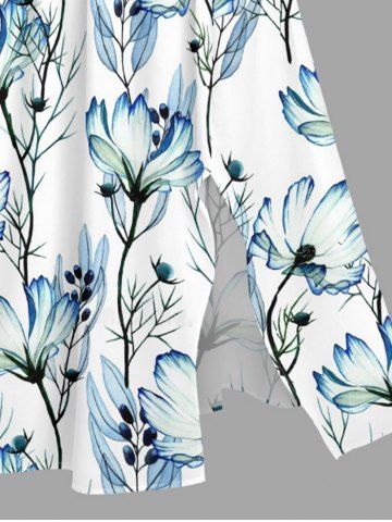 Plus Size Flowers Leaf Print Split Hawaii Midi Dress - Light Blue - M
