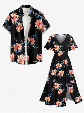 Plus Size Flowers Leaf Print Split Hawaii Midi Dress - Black - Xxs