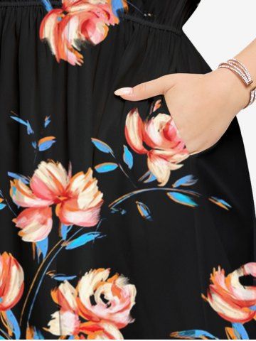 Plus Size Flowers Leaf Print Split Hawaii Midi Dress - Black - M