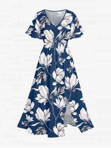 Plus Size Flowers Leaf Print Split Hawaii Midi Dress - Cadetblue - Xs