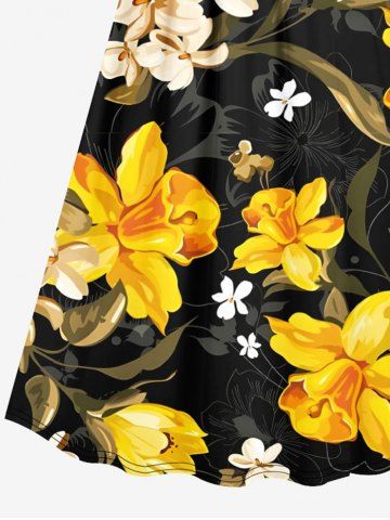 Plus Size Flowers Leaf Print Surplice Hawaii Cami Dress - Black - S